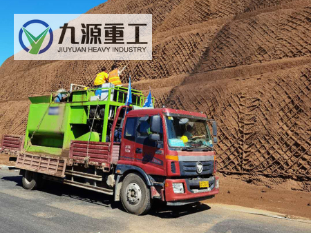 噴播機(jī)是應(yīng)用于邊坡綠化的專業(yè)設(shè)備,通過本設(shè)備將土壤基質(zhì)、綠化草籽、保水劑、黏合劑、肥料等,在噴播機(jī)攪拌罐中與水混合成膠狀的漿液,用泥漿泵將其噴播于坡面上。由于漿液中含有保水材料、黏合材料、各種養(yǎng)分,在保證了植物生長所需的水和其它營養(yǎng)物質(zhì)來源的同時有效防止雨水沖刷對噴播材料的破壞,故而植物能夠健康、迅速地成長。